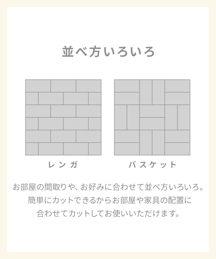 ・サイズには若干の誤差がありますので、タイル同士の隙間で調整しながら敷き詰めてください。