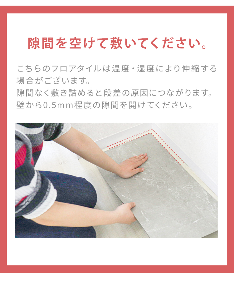 ・気温や湿度の変化でタイルが伸縮する場合があります。ぴったりと敷き詰めすぎると、伸びた際に突き合ってタイルが浮き上がってしまいますので少し隙間を開けながら敷きこんでください。