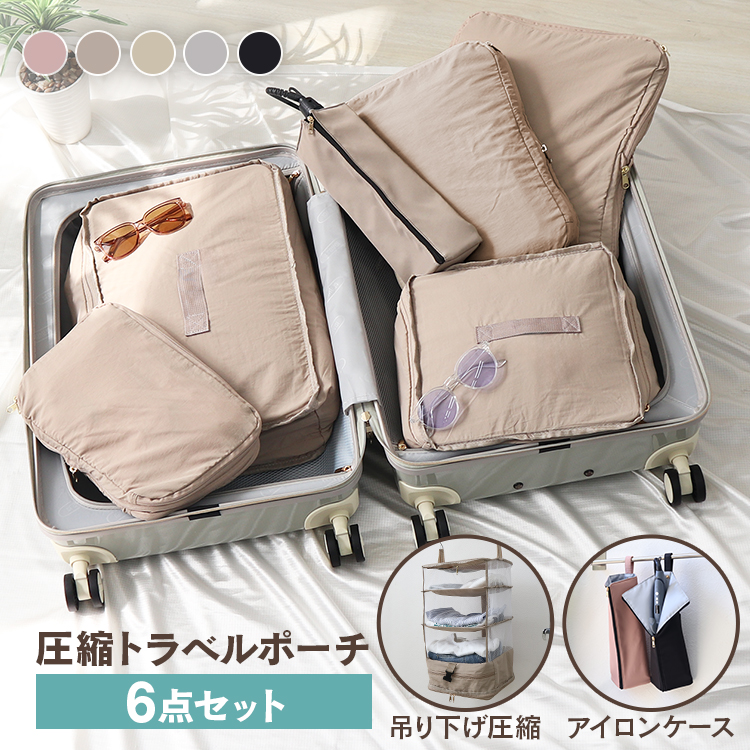 圧縮トラベルポーチ 6点セット トラベルポーチ 旅行 収納 圧縮ポーチ ファスナー 吊り下げ アイロンケース 旅行用ポーチ セット 出張