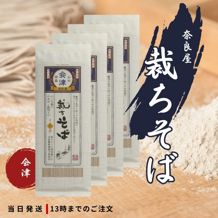 会津ではそばを打てないとお嫁に行けないといわれるほどそばが生活に欠かせない食べ物でした。60年前に奈良屋の八代目がそば打ちの技量のあまりない女性たちが打つ太さや長さの混ざっているそばが何気なく美味しい事を感じ、まるで広げた布を切るようなそば切りが布を裁つようであることから「裁ちそば」と命名しました。