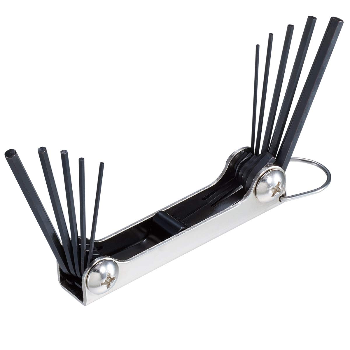 ・10本組の六角レンチセット。・折りたたみ式で携帯に便利。工具箱でもかさばりません。・トルクが必要なときは、90°にまげて締めます。・環境にも配慮したRoHS対応。原産国:日本・【セット内容】対辺サイズ:1.27(1/20")/1.5/1.6(1/16")/2/2.4(3/32")/2.5/3/3.2(1/8")/4/4.18(3/16")mm(六角穴付ボルト:M1.4/M1.6/M2/No.1/M2.5/No.4/No.5/M3/M4/M5/1/4"、六角穴付止めネジ:M2.5/M3/M5/M6/M4/No.10/1/4"/M8/3/8")【本数】10本【重量】115g ・【用途】六角穴付ボルト・六角穴付止めネジなどの締めつけ/ゆるめ作業、部品交換・組立作業、機械の分解・修理、バイク整備、自転車のメンテナンス、家具の組み立て、工作
