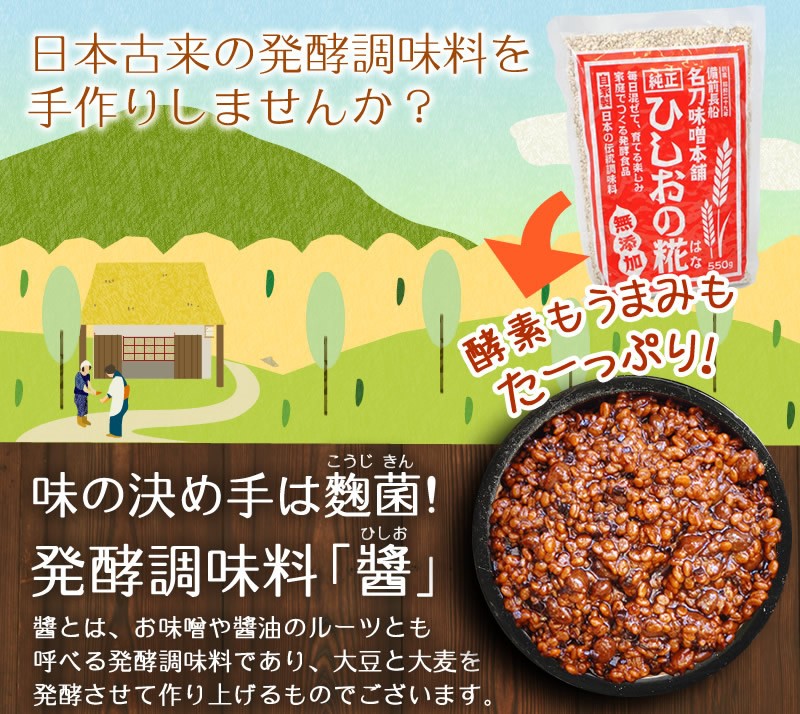 お味噌や醤油のルーツとも呼べる発酵調味料である「ひしお」をご自宅でもカンタンにつくることができます。この商品は「ひしお」をつくるための豆麹&麦麹です。