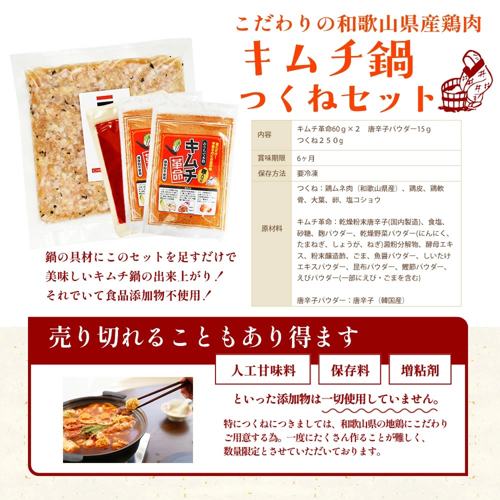 | 内 容 | つくね250g、キムチ革命60g×2袋、唐辛子パウダー15g |