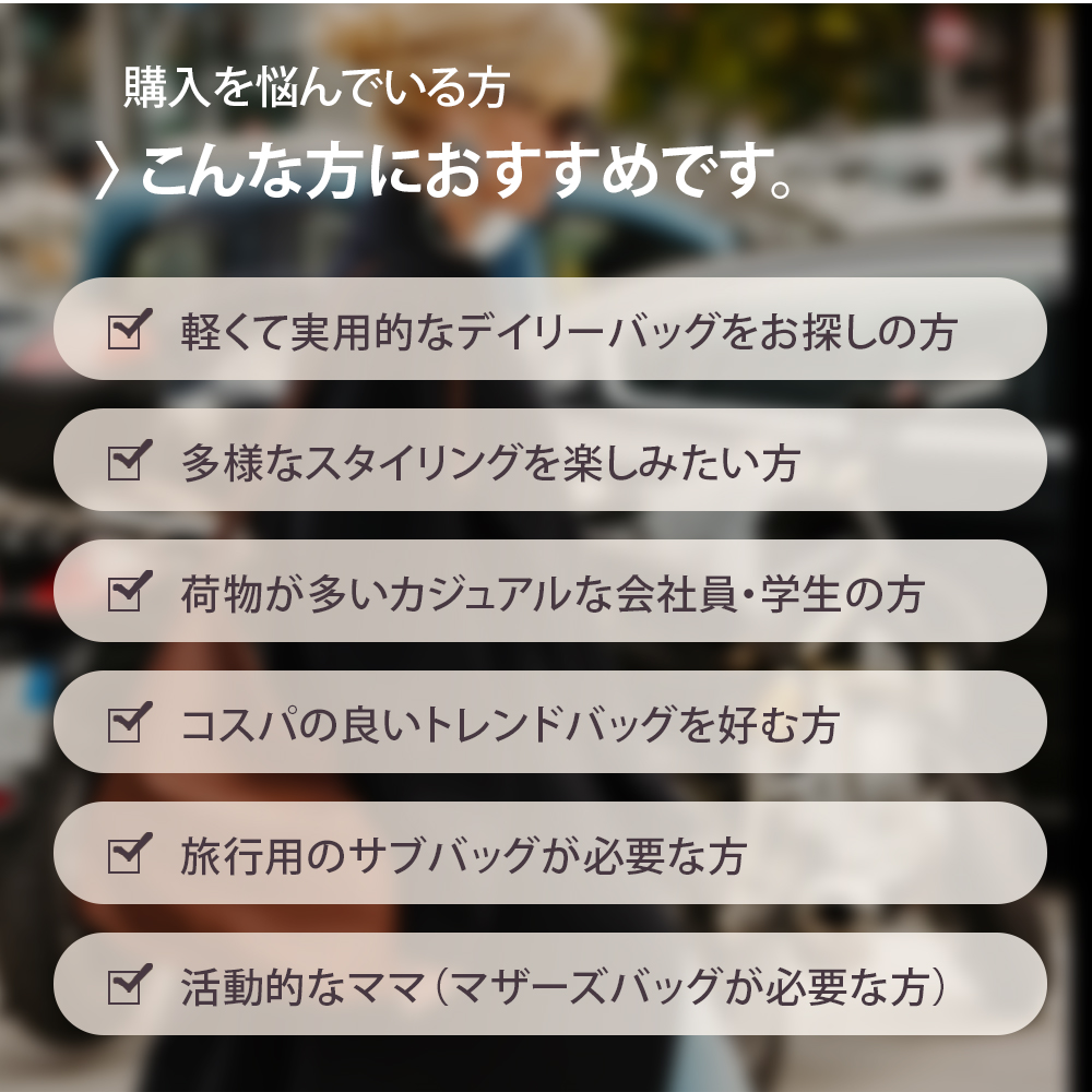 使いやすさにもこだわっており、見た目以上に収納できる優秀バッグ!