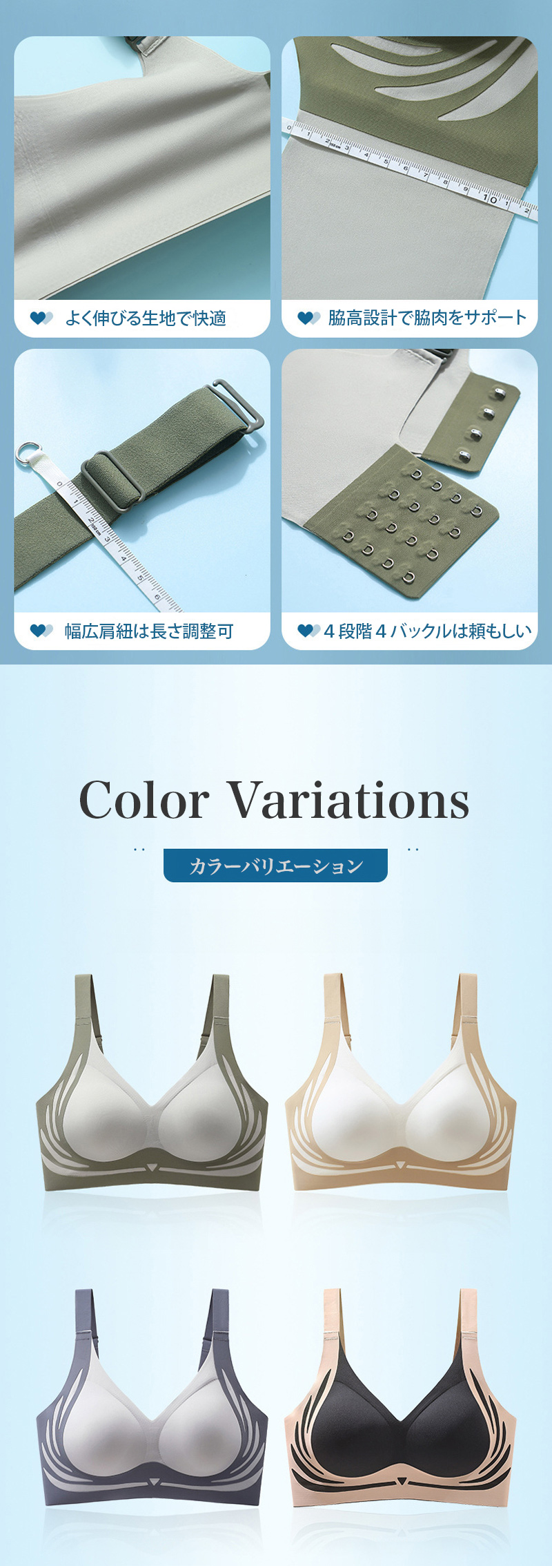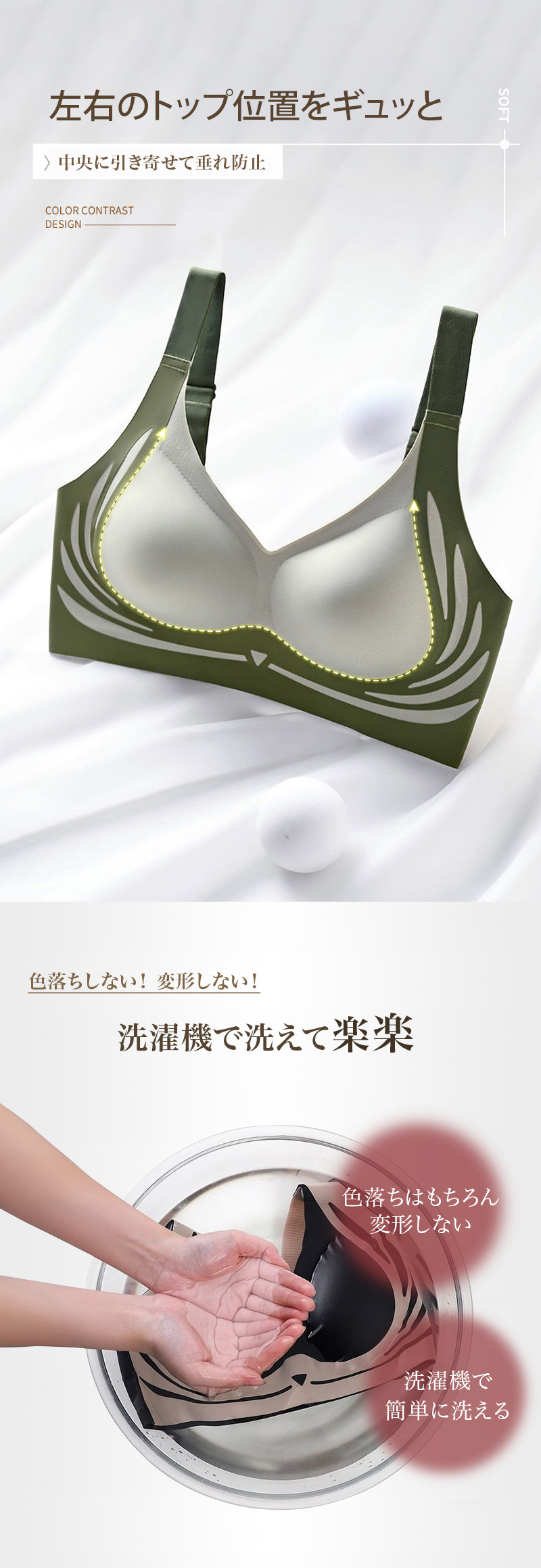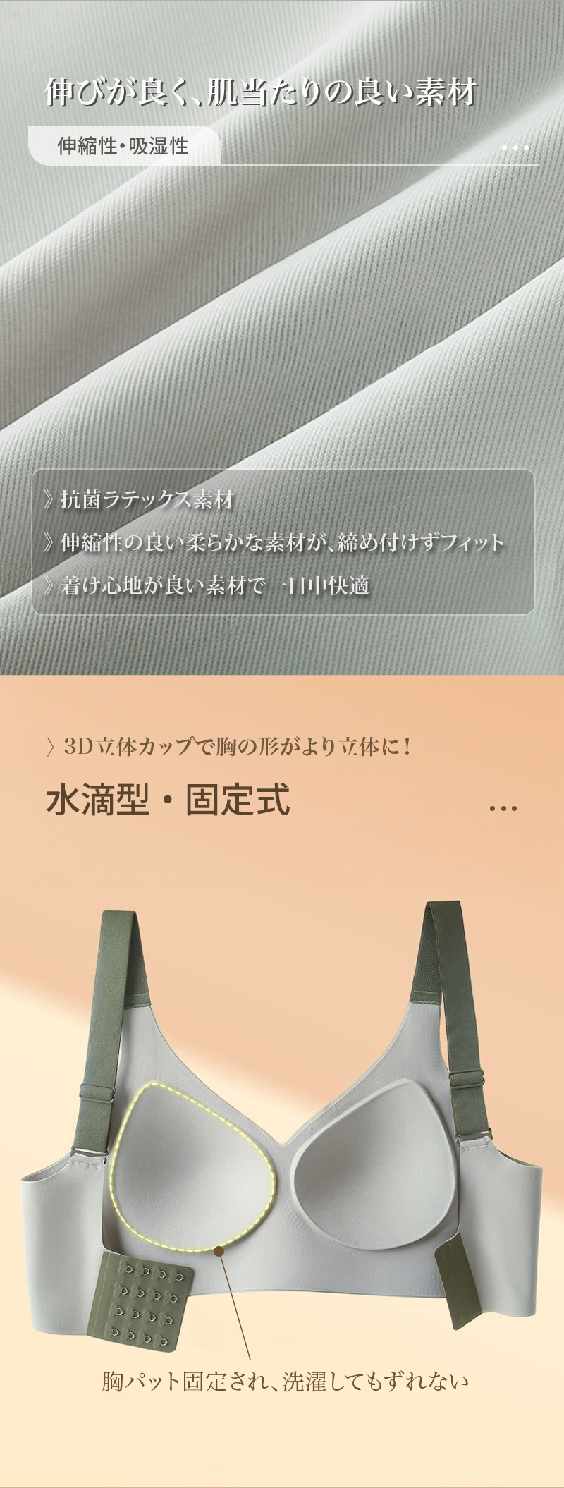 伸びが良く、肌当たりの良い素材のブラ! 柔らかくて握っても変形しにくいブラ! 脇高設計で背中と脇下の脂肪をスッキリ! 楽ブラ!