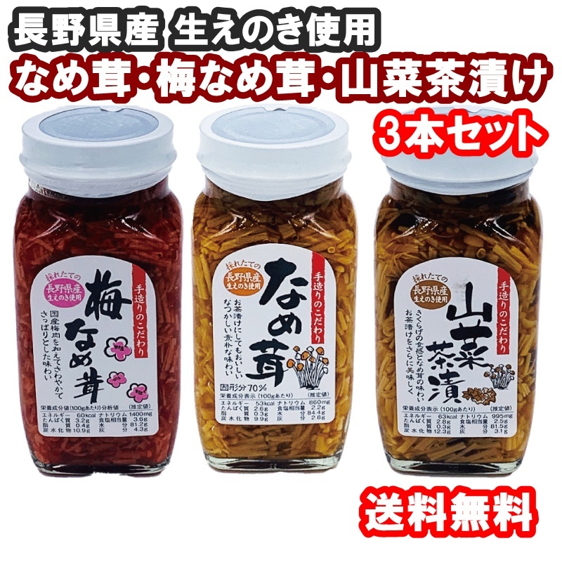 長野県産 なめ茸・梅なめ茸・山菜茶漬け 各280gの3本セット 手作り 採れたて 生エノキ使用 茶漬け