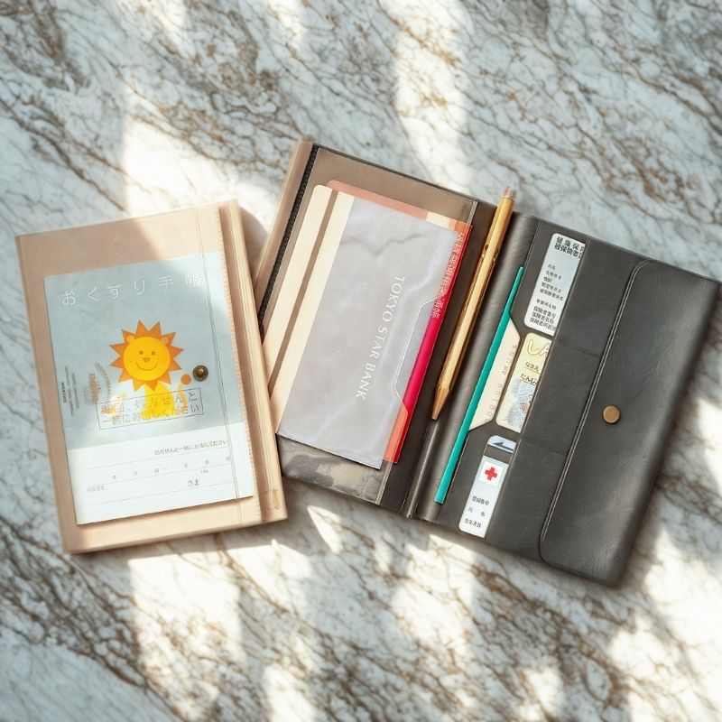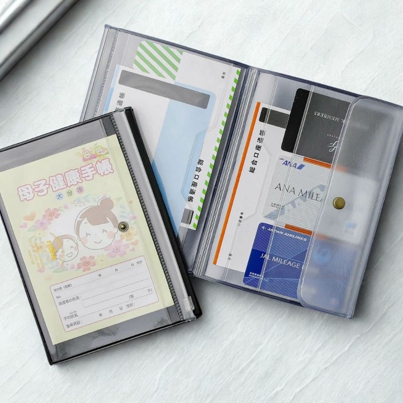 | 母子手帳を入れるのにもちょうどいいサイズ。通帳とカードをまとめたり、マスクや、一緒に持ち歩きたい診察券、保険証、こども医療証などまとめて整理してください。 |