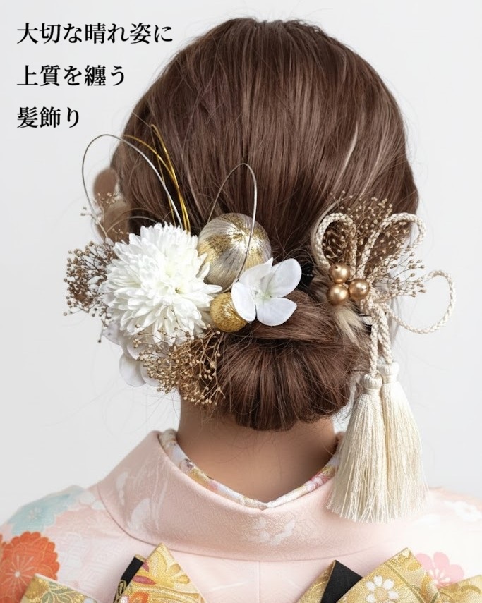 人気髪飾り(頭飾り/かみかざり/ヘア飾り)|和装小物・かんざし・祭り和風|おしゃれ&ゴージャス|ランキング常連アイテム【発送について】当店の商品はご注文後、即日発送いたします。お急ぎのお客様にも安心してご利用いただけるよう、迅速な対応を心がけています。発送方法は**レターパックプラス(速達)**を採用しており、全国どこへでもスピーディーにお届け可能です。成人式や卒業式、結婚式など、大切なご予定に間に合うよう丁寧に梱包してお送りします。【使用場面】本商品は、和装・洋装を問わず幅広いシーンでお使いいただけます。成人式(振袖や訪問着にぴったり)卒業式(袴姿を華やかに演出)結婚式(新婦・ゲスト・お呼ばれヘアに)ウェディング/ブライダル(和装婚・洋装婚どちらにも対応)前撮り(和洋兼用でアルバム映え)二次会(華やかなパーティーシーンに)七五三(753)(お子様の晴れ着姿にもぴったり)入学式・卒園式(フォーマルシーンを上品に彩る)発表会・舞台・演奏会(照明映えする華やかさ)パーティー・お呼ばれ・デート(特別な日をより印象的に)夏祭り・花火大会(浴衣に合わせて夏らしく演出)さらに、振袖・ドレス・留袖・浴衣・半襟・重ね衿・帯締め・巾着・和傘など、さまざまな和装小物とのコーディネートが可能です。髪型もひとつ結び、ボブ、くるりんぱ、三つ編み、アップスタイル、ポニーテールなどに自在にアレンジできます。【花材料】当店では厳選した高品質の造花と本物のプリザーブドフラワーを使用しています。造花はリアルな質感と発色を重視し、近くで見ても生花のような自然な美しさ。プリザーブドフラワーは本物の花を特殊加工し、瑞々しさと鮮やかな色合いを長期間保ちます。装飾には水引き・リボン・パール・和玉など、日本の伝統的な美意識とモダンなデザインを融合させたパーツを採用。花材はすべてIピン付きで、届いたその日からすぐにお使いいただけます。【デザインと特徴】ひとつひとつ丁寧な手作り:熟練の職人が心を込めて製作。全く同じものは存在しない唯一無二のハンドメイド品です。形や寸法の個体差:すべて手作業で仕上げるため、形や寸法に若干の違いがありますが、それこそが手作りならではの味わいです。季節・仕入れ時期による色味の変化:画像は販売当初のもので、花材の入荷状況により色合いが若干異なる場合があります。端末や設定による色差:モニター環境によって、実物と写真の色味や質感が異なって見える場合があります。【保管条件】高温・多湿・直射日光を避け、風通しの良い場所に保管してください。長期保管時は密封容器や防湿剤を併用すると、色あせや型崩れを防ぎやすくなります。プリザーブドフラワーは湿気に弱いため、梅雨時期や湿度の高い場所は特にご注意ください。【使用時のご注意】防水加工なし:雨や汗など水分に触れると、花材や装飾の変形・色落ちの原因となります。デリケートな作品:強い力で引っ張ったり、落下させないようにご注意ください。誤飲防止:小さなお子様やペットがいるご家庭では誤飲にご注意ください。万が一事故が発生しても当店では責任を負いかねます。色移りの可能性:濡れた状態での使用は衣類等に色移りする恐れがあります。【返品について】お客様都合による返品(色味・イメージ違いなど)はお受けできません。完璧な状態をお求めの方はご購入前に必ずお問い合わせください。製作や梱包には万全を期しておりますが、配送中の破損など万一不備がございましたら速やかにご連絡ください。【こんな方におすすめ】成人式や卒業式で人とは違う髪飾りを探している方和装・洋装どちらにも合うヘアアクセサリーをお求めの方写真映えするヘッドドレスを探しているフォトウェディング利用者大切な人へのギフトとして華やかなアイテムを贈りたい方【まとめ】本髪飾りは、日本の伝統美とモダンデザインを融合させた高級ヘアアクセサリーです。厳選された花材と繊細な職人技で作られ、あらゆるフォーマルシーンや特別な日に華やぎを添えます。手作りならではの温もりと唯一無二の存在感で、あなたの大切な日を彩ります。