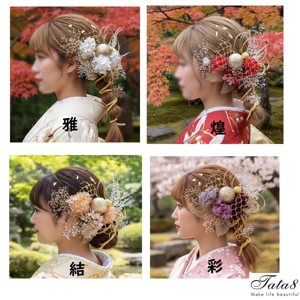 [髪飾り]5タイプ卒業式 袴 成人式 振袖 結婚式 前撮り ヘアピン付 和装 着物 花 水引 高級リボン 和玉 飾り紐 金箔 パール 白/赤/オレンジ/紫系/ゴールド55-59