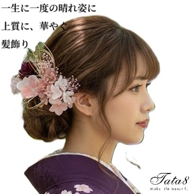 全髪型対応で、ポニーテール、アップスタイル、ハーフアップ、和髪など、さまざまなヘアアレンジに使用可能。振袖や袴、着物姿を華やかに引き立て、写真映えも抜群です。