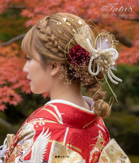 [髪飾りTATA8]成人式 卒業式 袴 結婚式 前撮り 着物 振袖 和玉 水引き 金箔 和紐/飾り紐 ドライフラワー(白/ゴールド/ホワイト系/赤系ワインレッド)43h