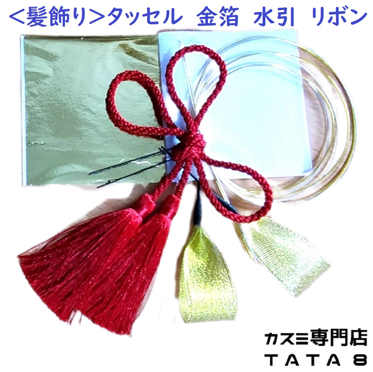 金箔、水引き、タッセル、リボンの髪飾りセットです。