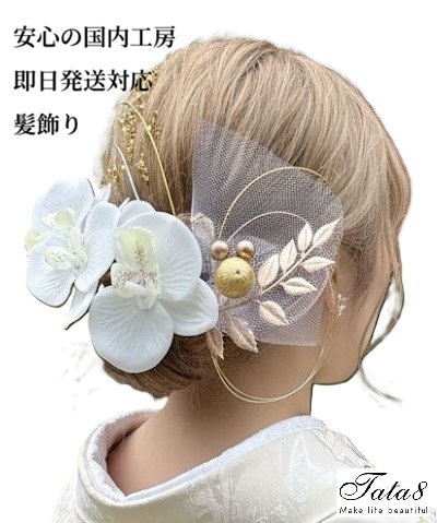 【髪飾り】卒業式 袴 結婚式 成人式 振袖 前撮り ヘアピン付 造花 振袖 和装 ウェディングドレス 袴 着物 ヘッドドレス 造花胡蝶蘭3輪 チュール 白/ゴールド85b