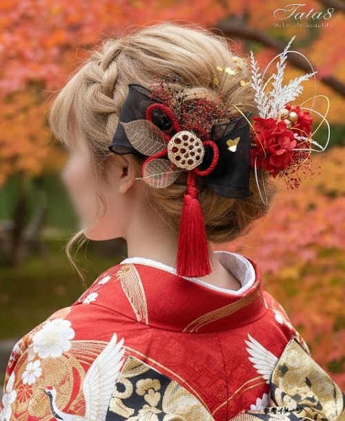 [髪飾りTATA8]成人式 髪飾り 卒業式 結婚式 振袖/袴 着物 和装 花 ドライフラワー 水引 タッセル リボン パール 金箔 赤/ゴールド/白/黒/シルバー53h