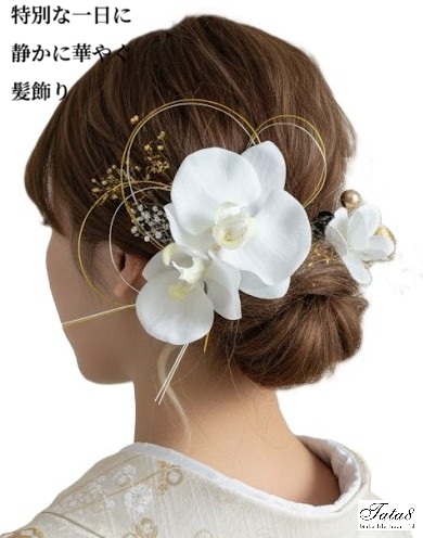 【国産髪飾り】成人式 振袖 卒業式 袴 結婚式 前撮り ピン付 着物 和装 七五三 白無垢 高級造花胡蝶蘭 水引き 金箔 パール ゴールド/白/シルバー981