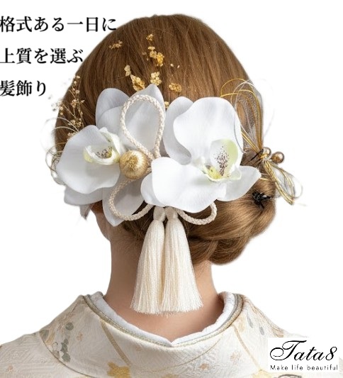 髪飾り 卒業式 袴 結婚式 成人式 振袖 前撮り ヘアピン付 胡蝶蘭2輪 着物 和装 七五三 蝶結び水引き タッセル 金箔 パール チュール ゴールド/白/シルバー68b
