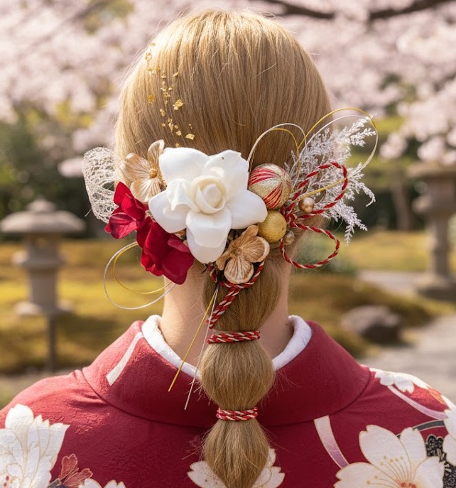 【髪飾りTata8】成人式 振袖 結婚式 卒業式 袴 和装 高級造花 プリザーブドフラワー 金箔 リボン 飾り紐 和玉 パール 水引き(白2/赤/ゴールド/シルバー)74bh