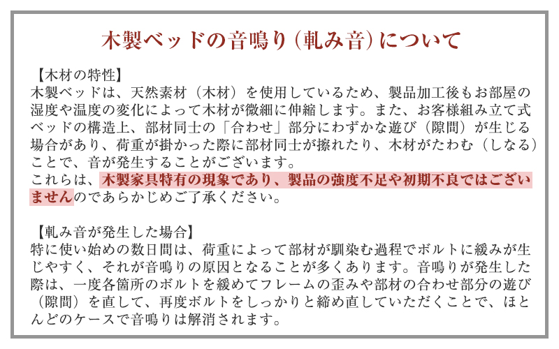●国産の天然檜を使用しています。 ●低ホルムアルデヒドF☆☆☆☆材料使用。 ●静荷重で200kg程度の強度を保てます。(工業試験場にて耐荷重400kg試験検査済み) ●檜すのこ板ピッチ:約1.5cm〜1.6cm ●6本脚構造なので揺れや軋みを抑えます。 ●脚部分は取り外しが可能なのでロータイプのすのこベッドとしてもお使いいただけます。 ※当店では加工の段階で現れる「色味」や「節目・節抜」を含む木材は品質や強度に影響がないと判断した場合には製品として完成させておりますのでご理解くださいますようお願いいたします。 ※天然木を使用しているので抜き節には埋め木をして処理をしております。 ※抜き節は処理が施されていない場合もございますが強度には問題なく不良ではございません。 ※天然木を使用しているため、木材の伸縮や個体差により、サイズや重量などに多少の誤差が生じる場合がございます。 |