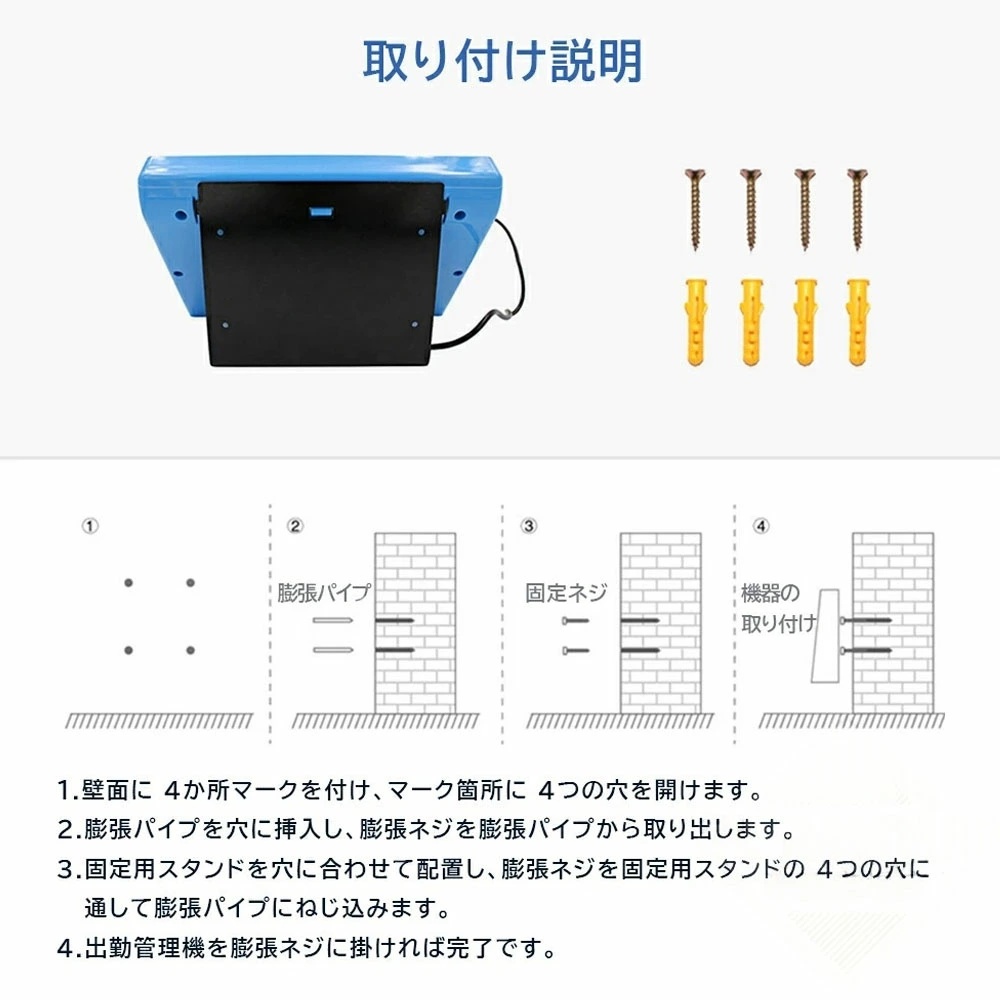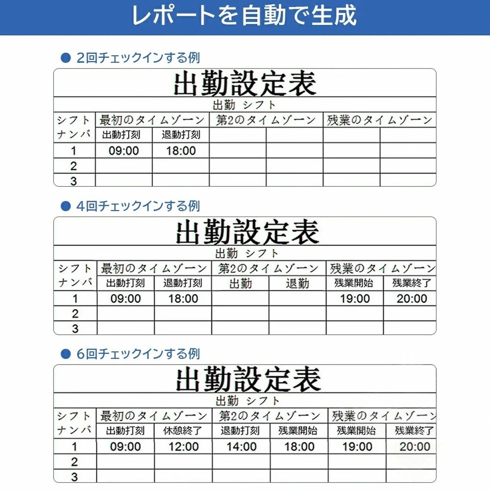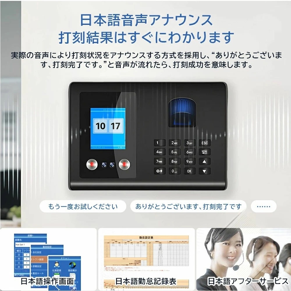 このタイムレコーダーは日本企業向けに特別に設計されており、日本語音声付きで使いやすいです。会社の勤怠プロセスを簡素化し、社員の通勤時間と勤怠データを自動的に記録し、手動の記録と検証の時間コストを削減し、作業効率を向上させます。勤怠データを通じて記録および分析することで、社員の働き方とリソースの利用状況をよりよく理解できるようになり、リソース配分の最適化とコスト削減につなげることができます。