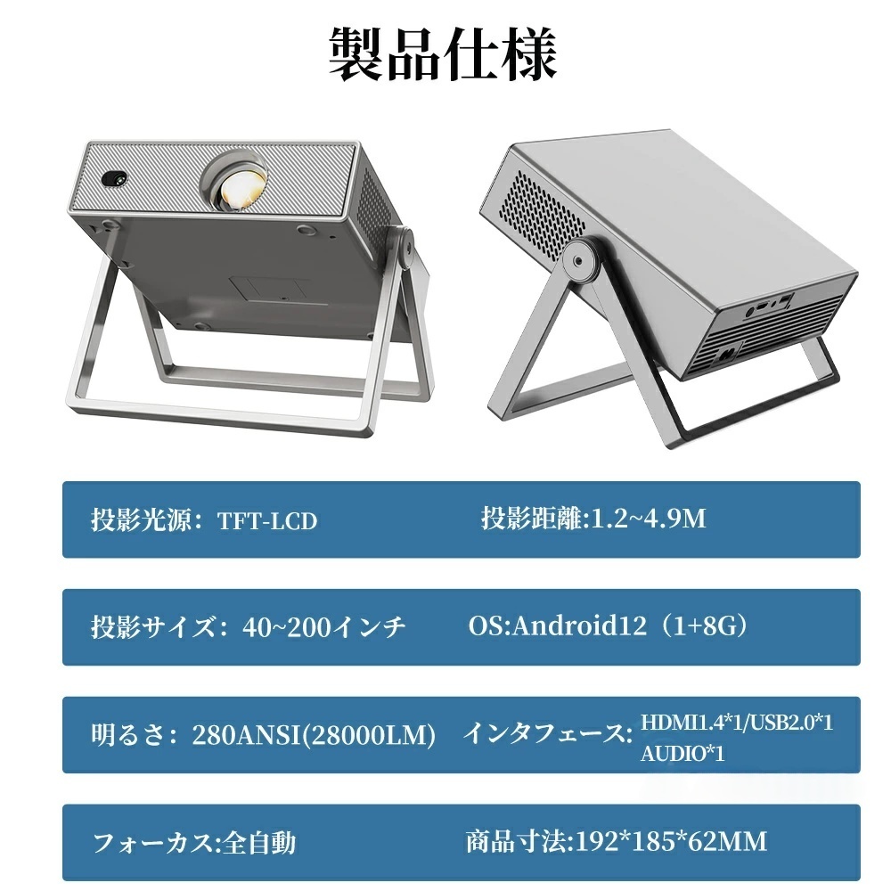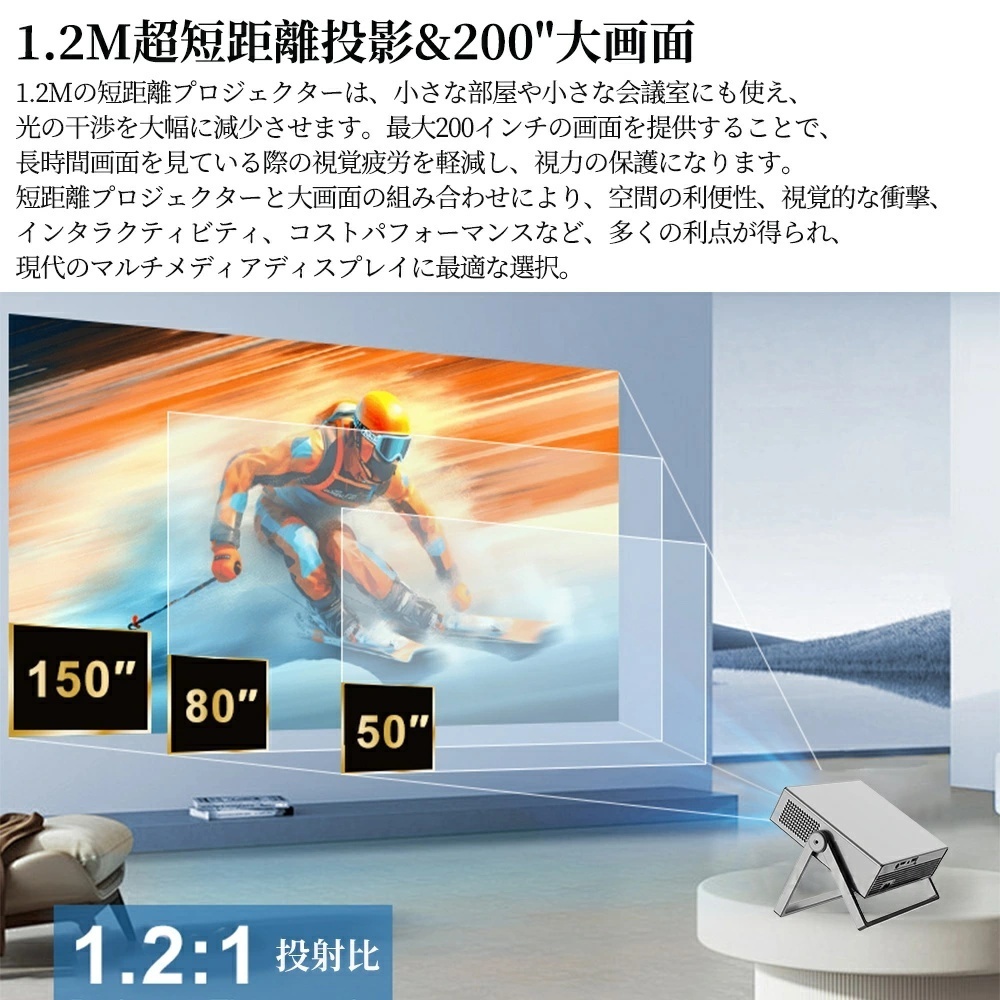 スクリーン自動アジャスト:スクリーンの枠にピタッと収まります。 さらに、1.2:1の投影比率により、約1mの距離があれば大画面を実現。日本の住宅環境(ワンルームや子供部屋)に最適な「狭い部屋でも大画面」を叶えます。50%〜100%のズーム機能も搭載し、設置場所を選びません。