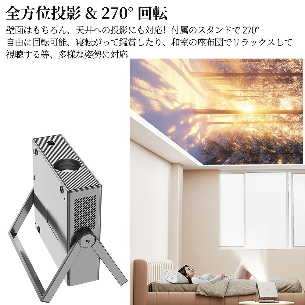 高輝度かつ鮮明な画質により、専用スクリーンがなくても綺麗に映ります。 白い壁はもちろん、柄のある壁紙やキャンプ場のテントなど、投影場所を選びません。準備の手間を省き、思い立ったその瞬間に映画鑑賞やプレゼン、思い出の写真共有が可能です。スクリーン購入費用も節約でき、ミニマルなライフスタイルに最適です。天井投影も自由自在!革新的な一体型スタンド