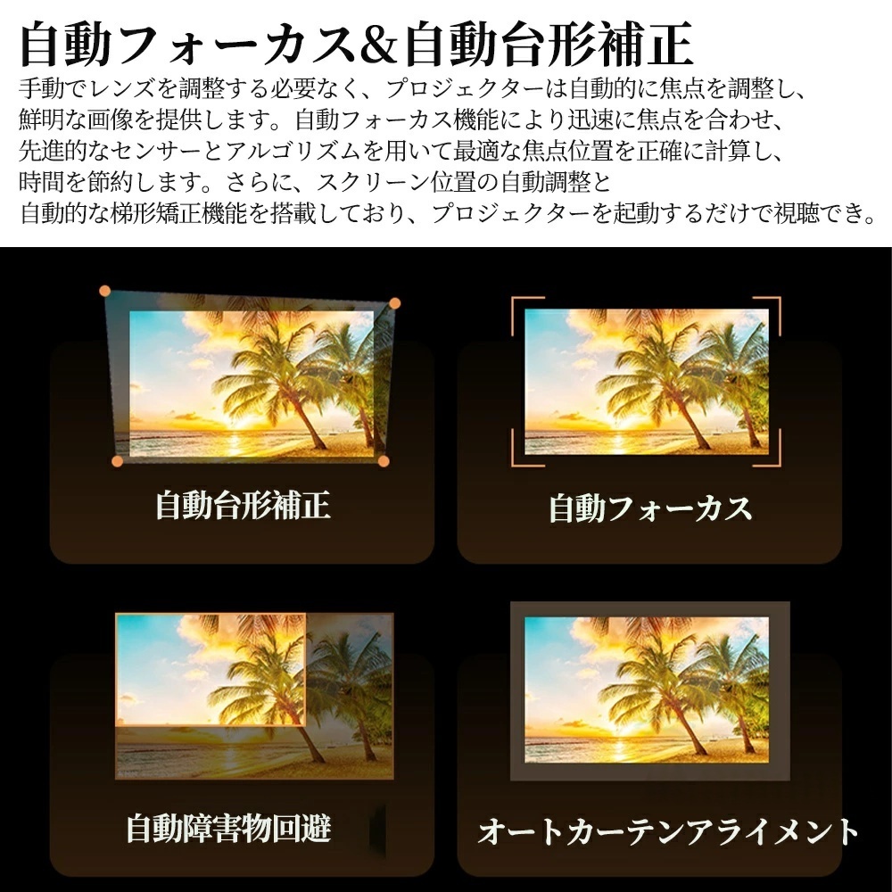 全自動台形補正:上下左右、斜めから置いても自動で四角い画面に。