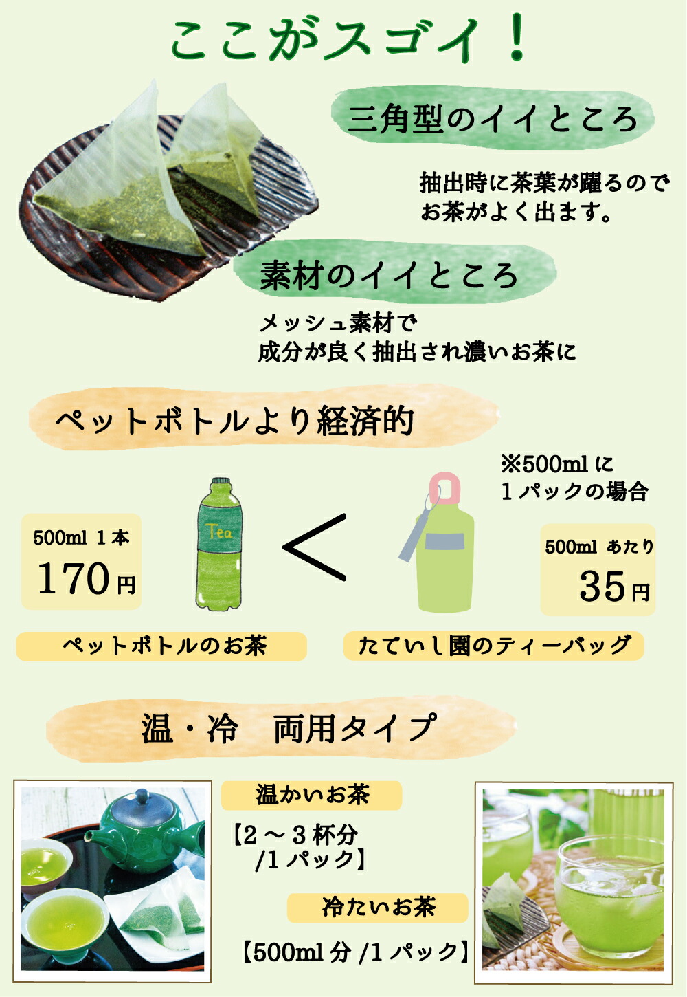 三角型でメッシュ素材のパックの為、茶葉がパックの中で回ってお茶の出が良くなります。 お味やお茶の成分は、もちろんペットボトルの緑茶に負けません。 濃くて美味しいお茶、経済的なティーバッグをお探しならおすすめです。 |