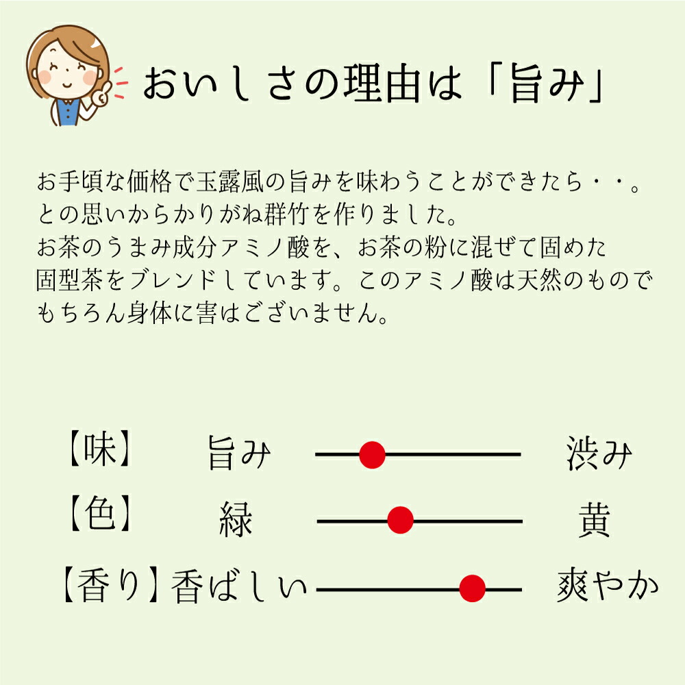 | 旨味成分は低温で抽出されやすいため、通常湯冷ましをしますが、このお茶は湯冷ましをしなくても甘みがあります。 |