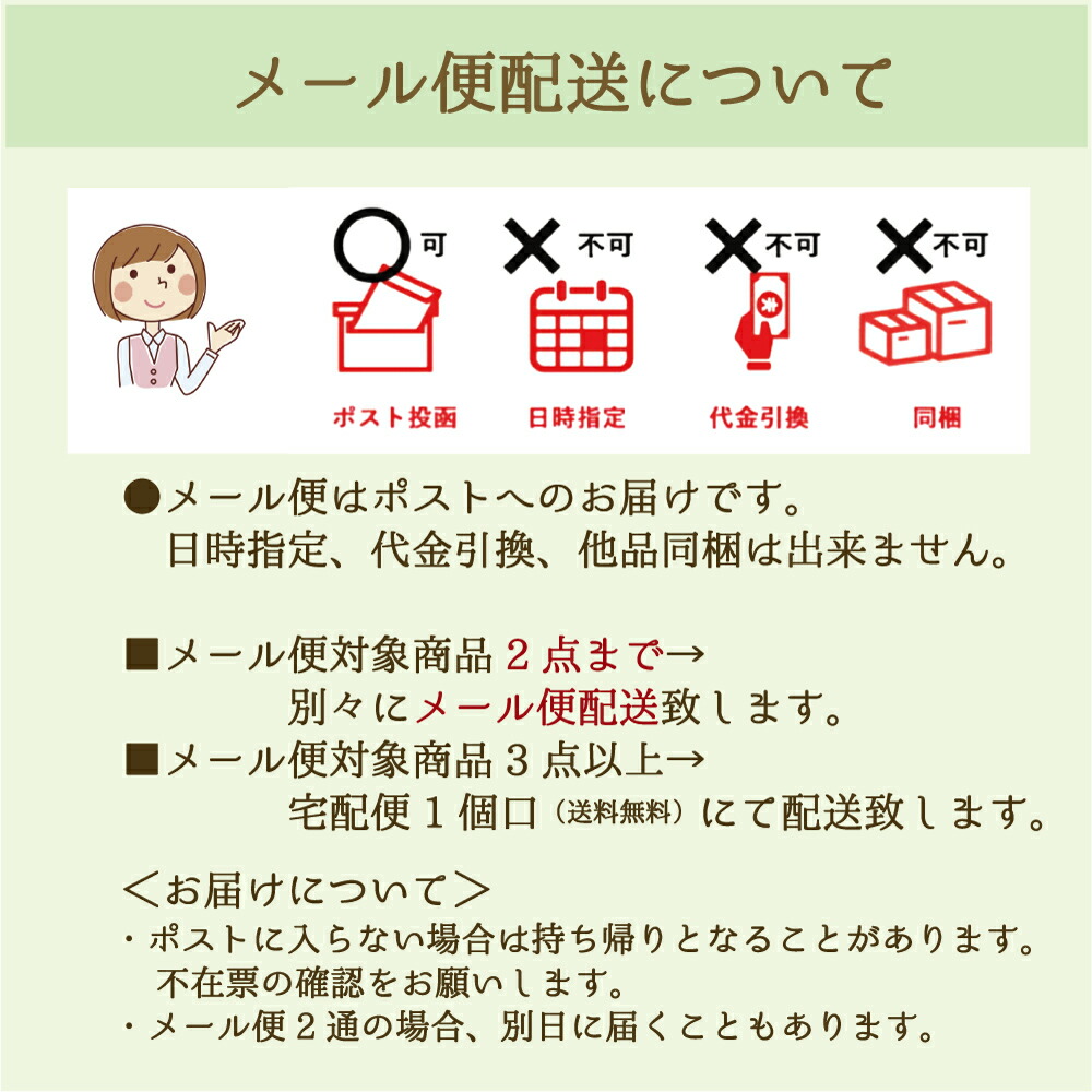 メール便対象商品3袋以上の場合は「宅配便」へ基本的に変更させていただきます。 ご了承のほど宜しくお願い致します。 「日時指定」「代金引換」「他品同梱」は出来ません。 |
