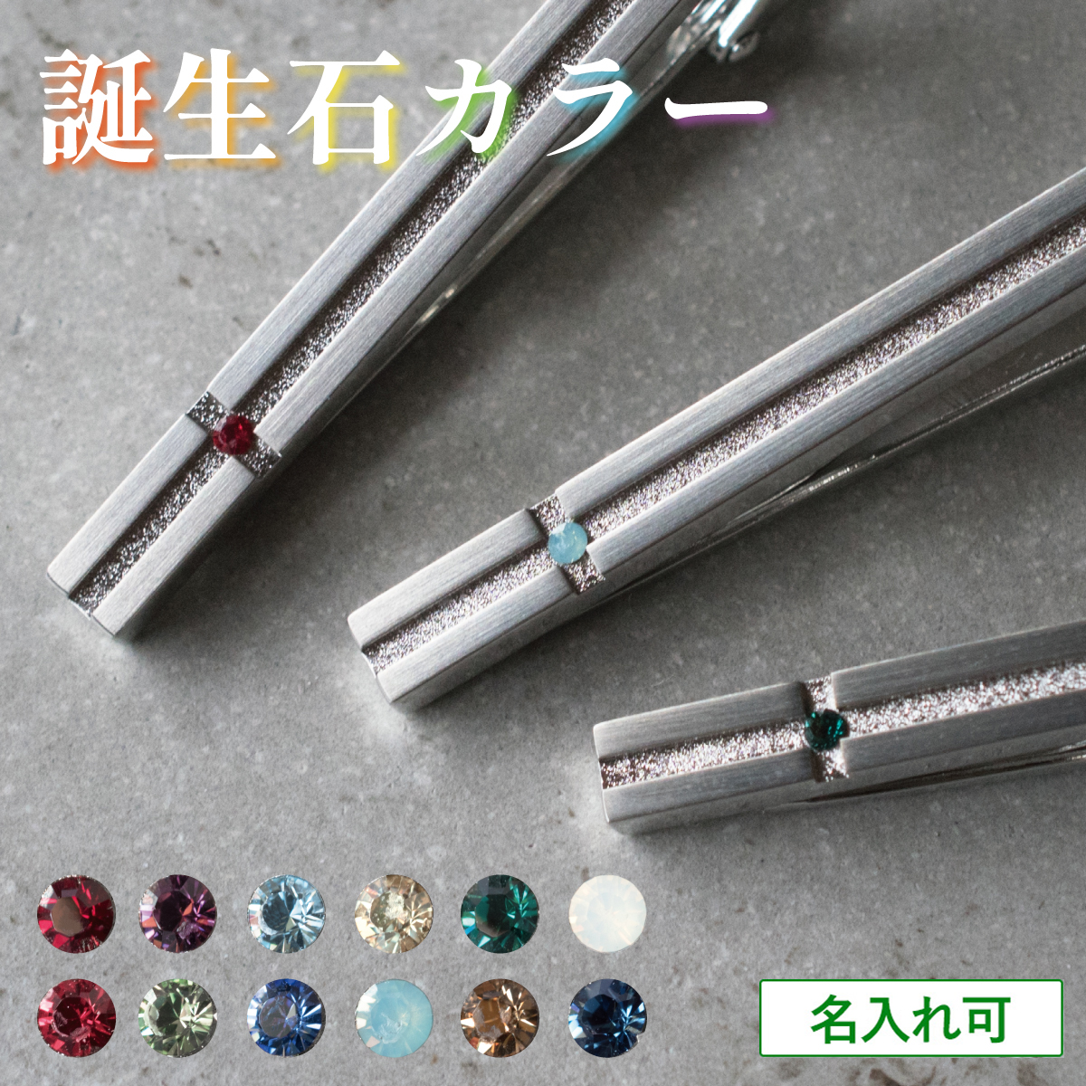 誕生石カラーのネクタイピン 誕生石とは、生まれた月を表す宝石のことですが、それぞれの宝石には意味があり、自身の誕生石を持つことで幸せが訪れると信じられています。 このネクタイピンには、誕生石カラーのクリスタルガラスをクロスデザインの中央にあしらいました。誕生日や、記念日の贈り物に相手の幸福をいのった贈り物はいかがでしょうか。 ※天然石は使用しておりません。 ![]() ![]() 1月〜6月の誕生石 ![]() 7月〜12月の誕生石 ![]() ![]() ヨーロッパ製の精密にカットされたクリスタルガラスをクロス部分に埋め込み、丁寧に仕上げています。 ![]() ![]() 本製品は金具にクロスのデザインを彫り、溝の部分にホーニング(サンドブラスト加工)、表面部分にサテーナ加工を施しています。どちらも貴金属に施されることの多い加工で、表面の艶を抑えて高級感と落ち着いた雰囲気を作り出し、かつ指紋を目立ちにくくする効果もございます。 タイピンの留め具にはワニ口タイプのものを採用しております。しっかりとネクタイを留めてくれるので、知らぬ間に外れてしまったという心配もなくなります。(写真はTps-113カラードピンです。) ![]() ワニロ式と、クリップ式の2タイプネクタイピンには主に本製品のようなワニロ式と、よりシンプルな形状のクリップ式がございます。上記バナーから商品一覧をご覧いただけます。 ![]() 製造は大阪の金属加工工場にて行っております。工業製品を作り続けてきた熟練の金属加工職人の手によって丁寧にプレス・研磨された、MADE IN OSAKAのネクタイピンです。 ■クロスネクタイピンはこちら![]() 名入れオプションで 名前やイニシャル、メッセージなどをオプションで刻印することも可能(12文字まで)。ご自身用にはもちろん、大切な方のお祝いや、記念日のギフトとしてもおすすめです。