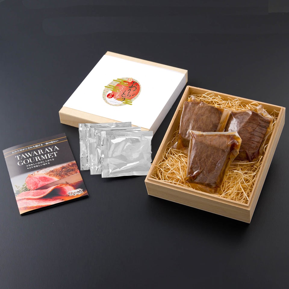 国産 黒毛 和牛 ローストビーフ たれ付 福来 プレミアム希少部位 ザブトン3個入り 木箱仕様 ギフト プレゼント ソース付