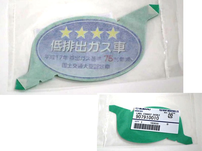 907910010【スバル純正】ラベル:エキゾーストコーション(低排出ガス H17年度基準75%減)1枚【メール便OK】