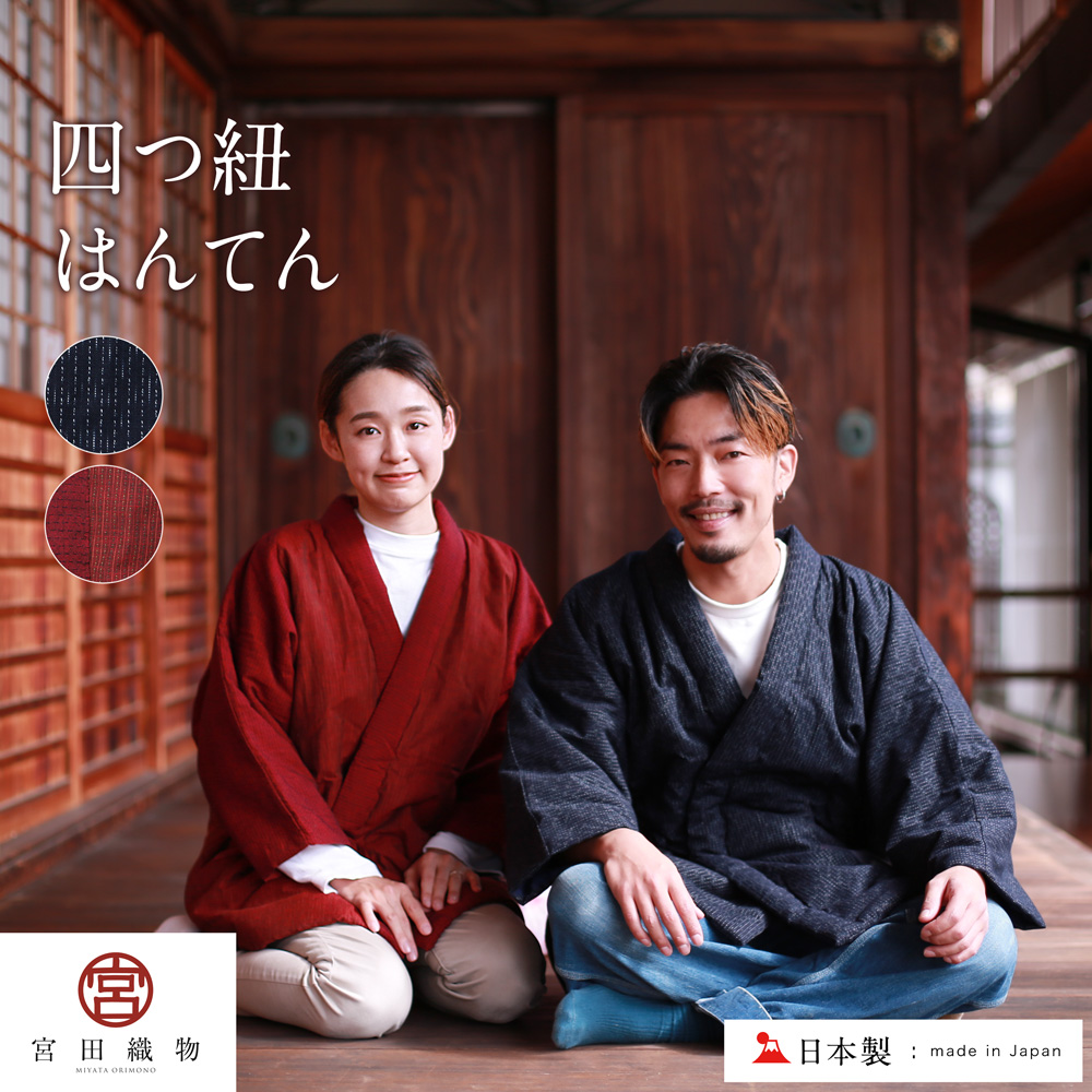 宮田織物 四つ紐はんてん 久留米織 日本製 半纏 どてら ちゃんちゃんこ 部屋着 ルームウェア 冬 久留米 中わた 綿 綿100% 前合わせ