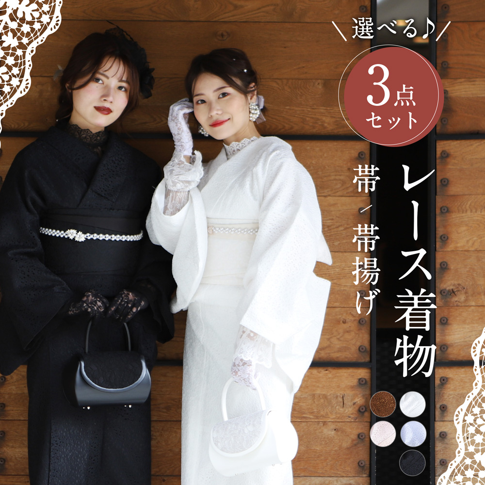 レース着物 半幅帯 帯揚げ 3点セット お仕立て上がり レディース 袷 フリー きもの セット レース おしゃれ 可愛い 白 黒 ピンク 水色 ブラウン