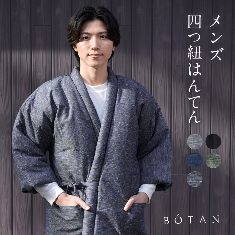 四つ紐はんてん 前合わせ メンズ 久留米織 はんてん 暖かい 冬 部屋着 ルームウェア 男性用 BOTAN ボタン 黒 グレー グリーン 半天 半纏 防寒