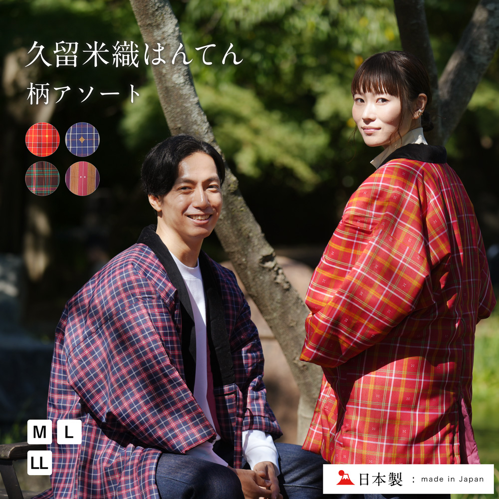 | 織物の産地として知られる福岡は久留米。戦後から始まった綿入り半纏作りは、今や全国の製造シェアの95%に及びます。名産織物の久留米絣にちなみ、昭和35年頃から「久留米はんてん」と呼ぶ様になりました。 日本ならではの寒さ対策として古くから愛されてきたはんてんは、どこか懐かしい温かみのあるデザインとゆったりとした着心地の良さが近年でも注目されるように。 久留米織の優しい肌触りと、上質な裏地、中綿で体を包み込む、まるで布団を着ているような感覚と言えるでしょう。