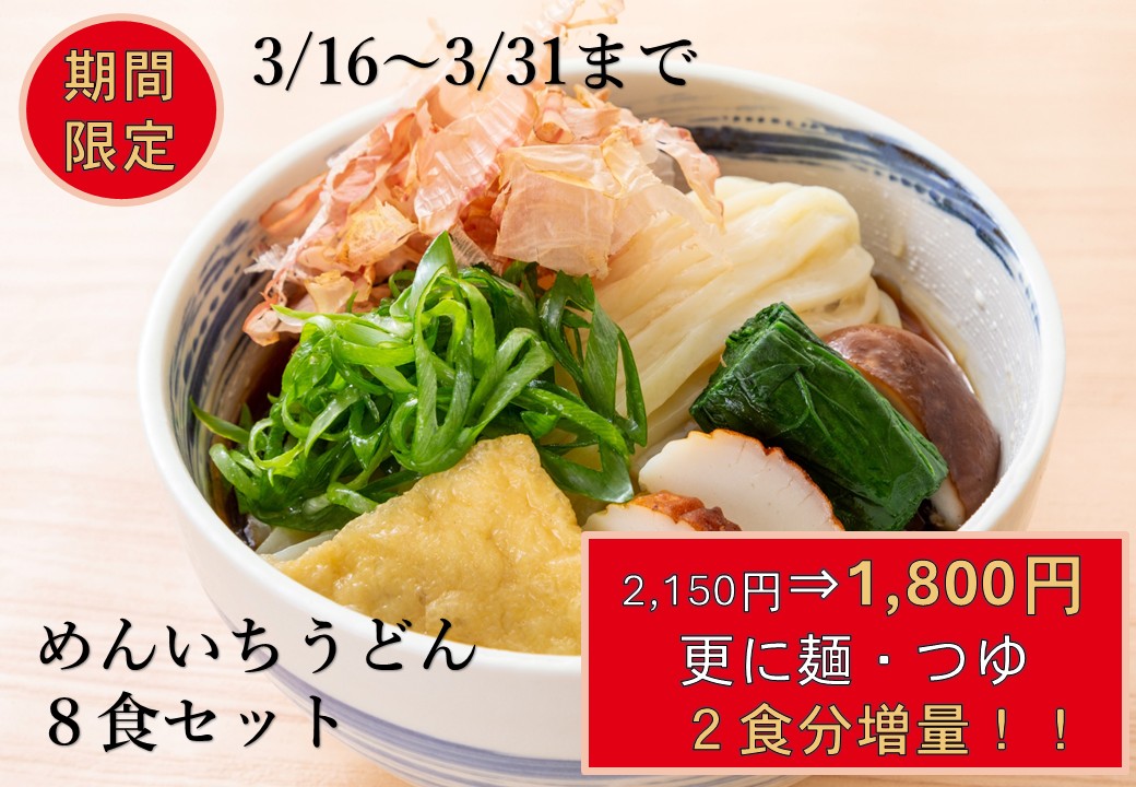 | 商品内容 | 太うどん:4食⇒6食 だしつゆ:4つ⇒6つ 細うどん:4食 ざるつゆ:4つ |