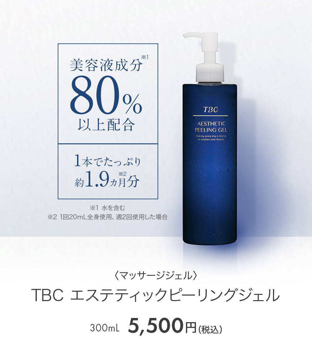 「エステティックピーリングジェル」は、やさしくマッサージすることで肌表面の古い角質や汚れをからめとり、すべすべの素肌に整えます。