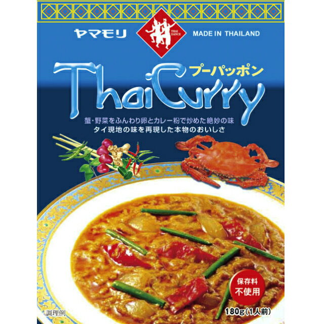 | 名称 | カレー | | 販売者 | ヤマモリ株式会社 | | 内容量 | 180g | | 賞味期限 | 製造から約2年 | | アレルゲン | えび、大豆、鶏肉 | | 原材料 | 野菜(玉ねぎ、ねぎ、にんにく)、液卵、大豆油、唐辛子、チリペースト、ナンプラー、香味油、カレー粉、砂糖、シュリンプペースト、かに、酵母エキス、オイスターソース、かに殻パウダー、食塩、クミン、増粘剤(加工デンプン)、増粘多糖類)、調味料(アミノ酸等)、酸味料、塩化カルシウム、パプリカ色素、カラメル色素、(原材料の一部にえびを含む) | | 商品説明 | プー(蟹)、パット(炒める)、ポンカリー(カレー粉)と呼ばれる、タイの海鮮レストランでの人気メニューです。 蟹と香味野菜を卵とカレー粉で炒めました。
