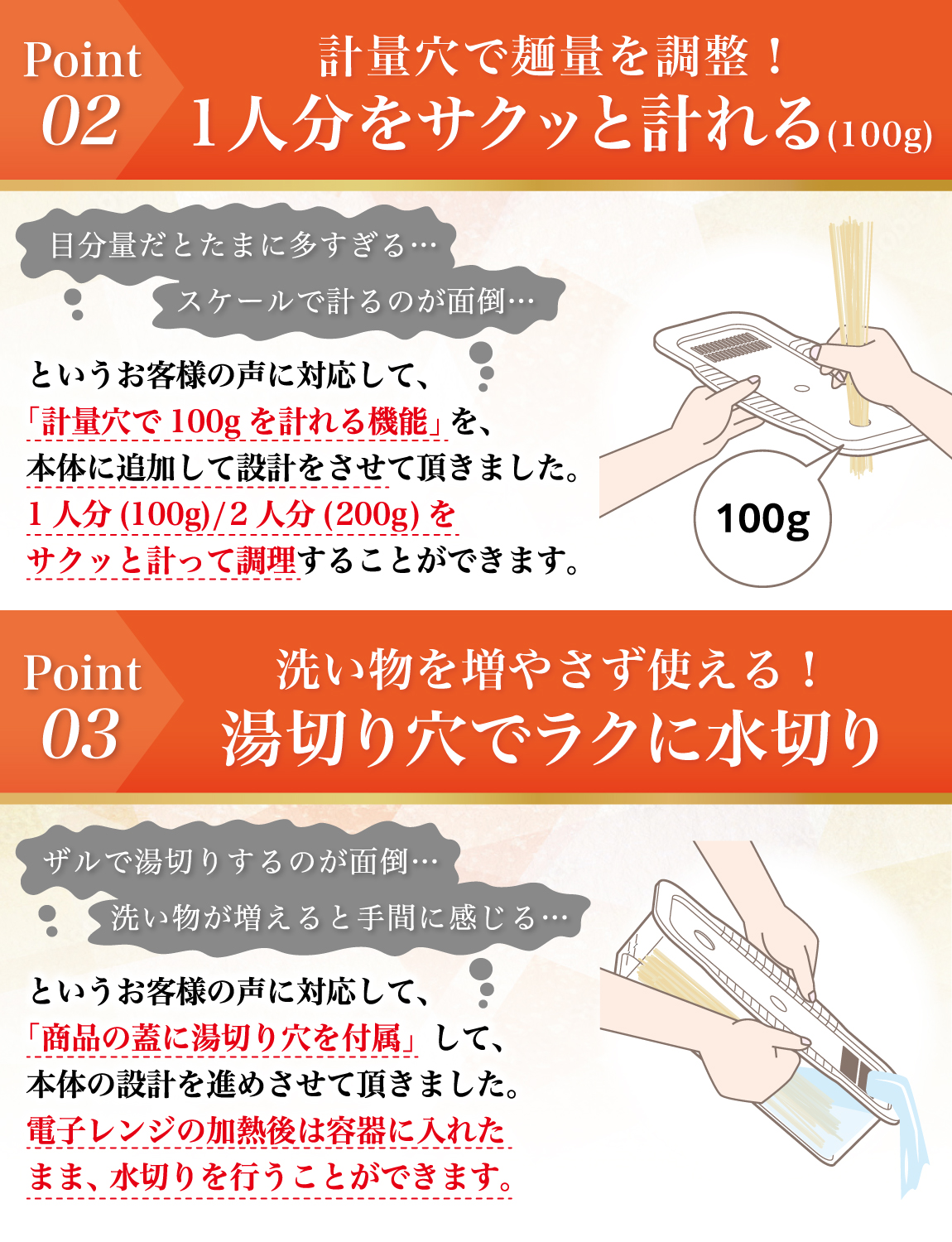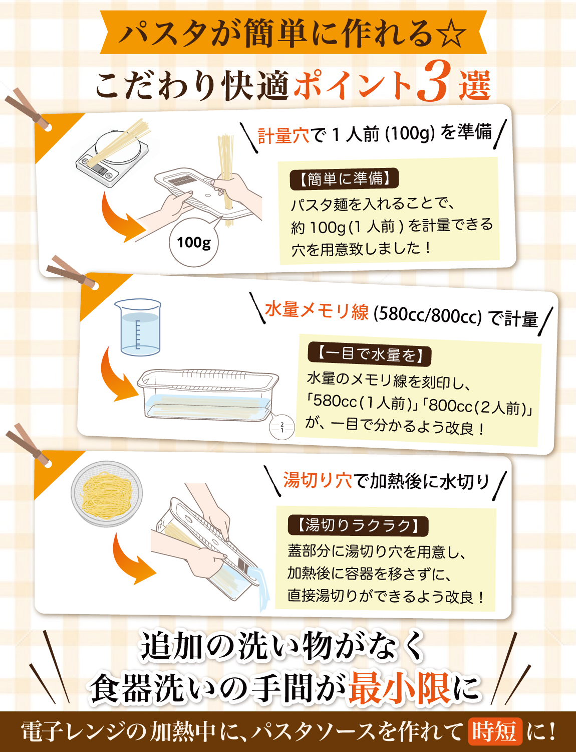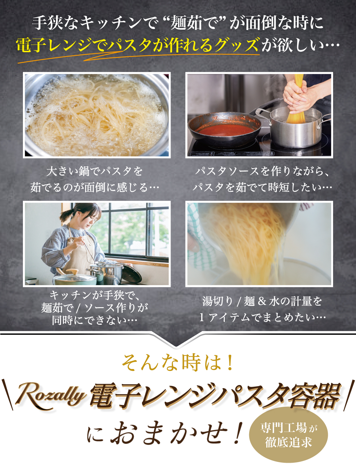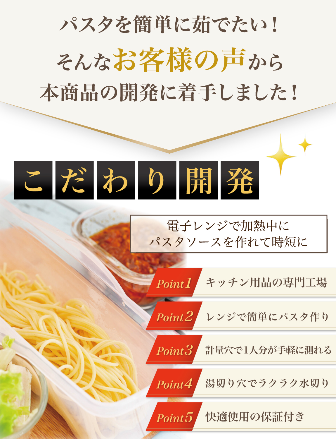 そんなお客様の声から生まれた快適にパスタを作り調理容器です。