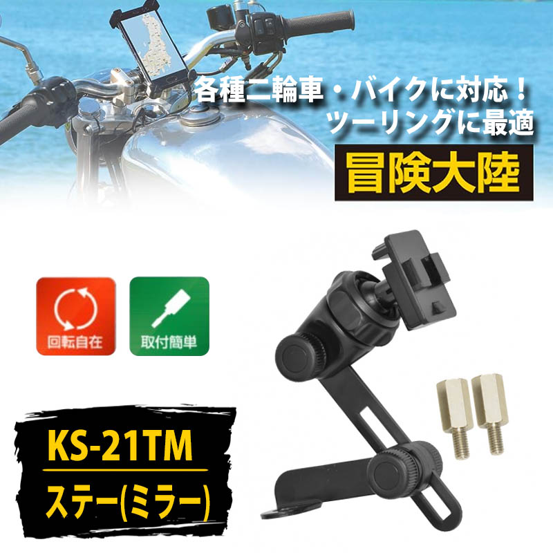 【冒険大陸】二輪用 専用取付ステー ミラータイプ 変幻自在 回転自在 取付簡単 KS-21TM バイク ナビ ステー