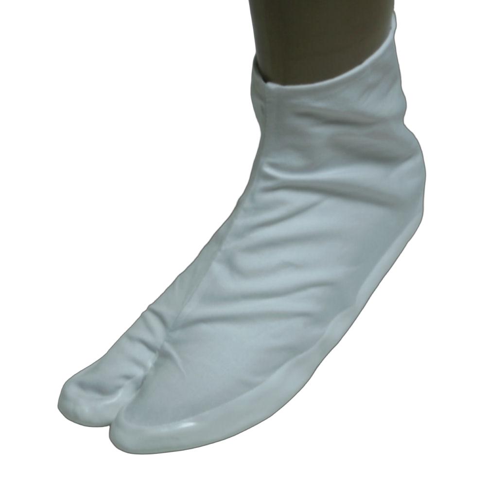 以前販売しておりました天然ゴム系の樹脂ゴムを塗布した阿波踊り足袋に比べ、圧倒的に耐候・耐摩耗性に優れ、足に沿うような柔軟性を備えております。