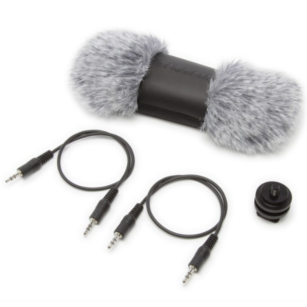 カメラのアクセサリーシューへのマウントを可能にするシューマウントアダプター、カメラへの音声出力と音声モニターリングを両立する3.5mmステレオミニジャックケーブル2本、屋外での録音に便利なファーウィンドスクリーンがセットになっています。