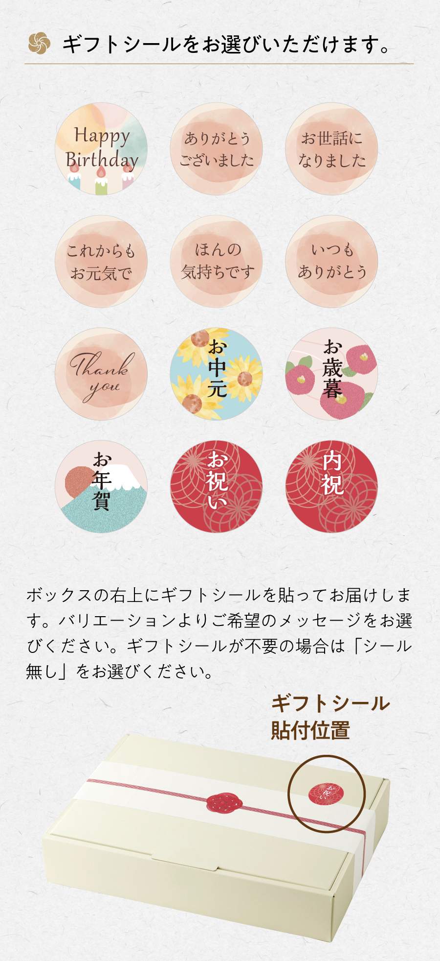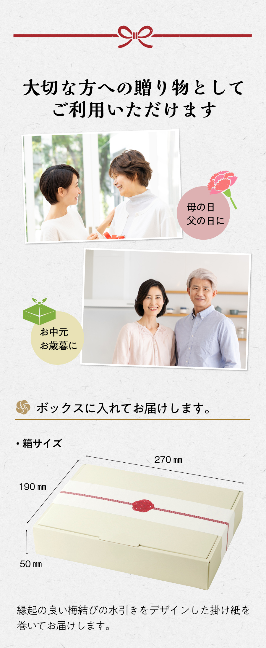 ギフトボックスに入れ、掛け紙をかけてお届けいたします。