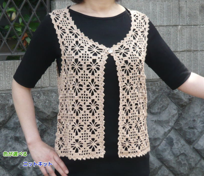 毛糸 夏糸 エミーグランデで編む花模様が映えるワンボタンベスト セット 編み物キット 無料編み図