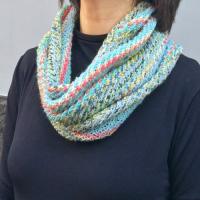 カラフルな段染めが映える、ゆったりしたデザインのスヌード
