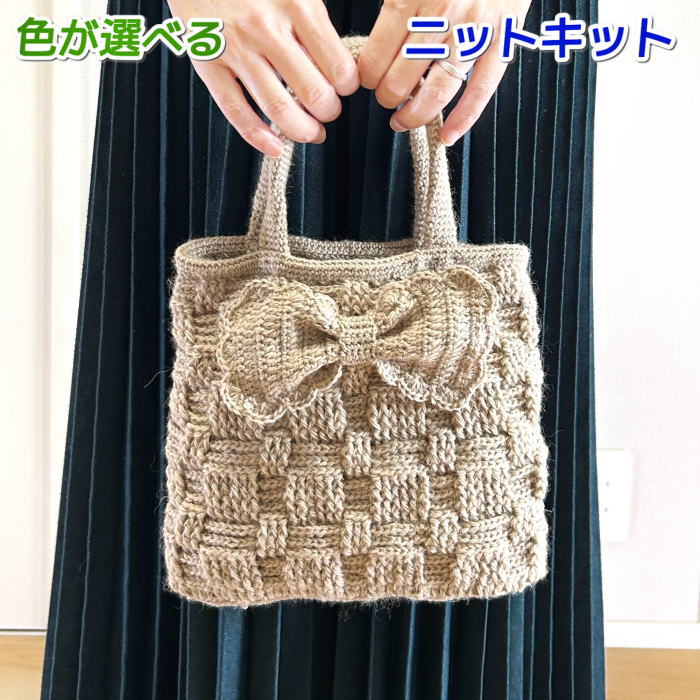 毛糸 タータンで編むリボンが可愛いバスケット模様のバッグ セット 無料編み図 編み物キット