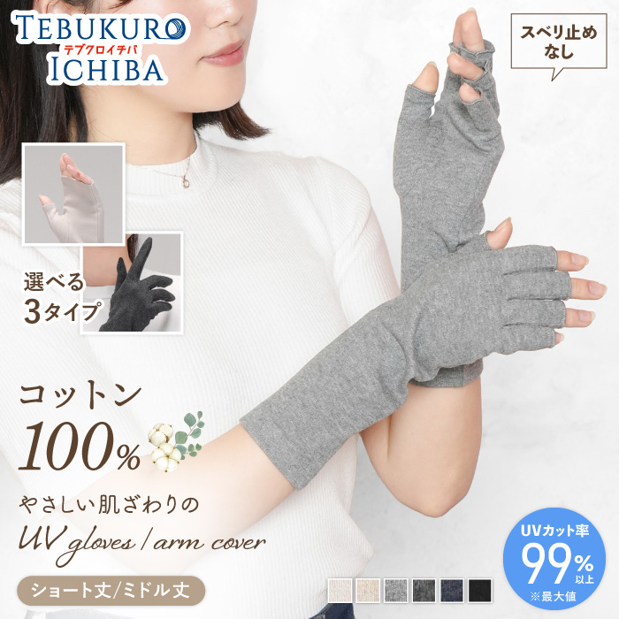 綿100% 滑り止めなし 99%UVカット 手袋 指切り 指なし 五本指 ミドル 吸汗吸湿 冷房対策 婦人 レディース UV手袋 アームカバー 手の甲 指先フリー ショート