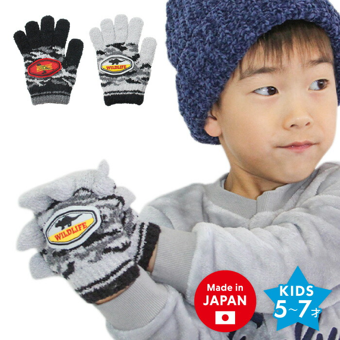 キッズ 恐竜 ワッペン のびのび 手袋 日本製 ニット フリーサイズ 防寒 保温 暖かい あたたかい かっこいい 男児 男の子 子供 迷彩 5本指 グローブ 洗える
