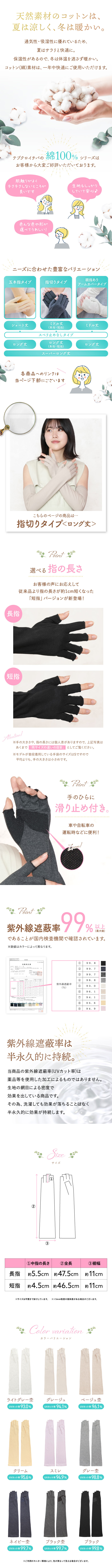 綿100% 最大99%UVカット UVアームカバー 指切り ロング 滑り止め 吸汗吸湿 婦人 レディース 指先フリー 紫外線対策 UVカット 日焼け防止 コットン100% 春 夏